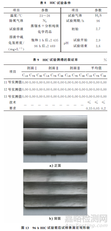 從遠(yuǎn)離開裂部位的管道上截取縱向試樣,尺寸(長×寬×厚)為100mm×20mm×5mm,依據(jù)GB/T 8650—2015 《管線鋼和壓力容器鋼抗氫致開裂評定方法》進(jìn)行抗氫致開裂(HIC)試驗,試驗條件如表8所示,試驗結(jié)果如表9所示(表中CSR為裂紋敏感率,CLR為裂紋長度率,CTR為裂紋厚度率),96hHIC試驗前后試樣表面的宏觀形貌如圖13所示。試驗結(jié)果符合GB/T 9711—2017標(biāo)準(zhǔn)要求。