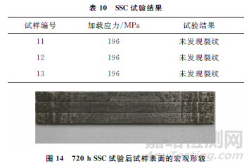 從遠(yuǎn)離開裂部位的管道上截取縱向試樣,依據(jù)GB/T 4157—2017 《金屬在硫化氫環(huán)境中抗硫化物應(yīng)力開裂和應(yīng)力腐蝕開裂的實驗室試驗方法》方法A,進(jìn)行抗硫化物應(yīng)力開裂(SSC)試驗,試驗結(jié)果如表10所示,720hSSC試驗后,試樣表面的宏觀形貌如圖14所示。試驗結(jié)果符合GB/T 9711—2017標(biāo)準(zhǔn)要求。