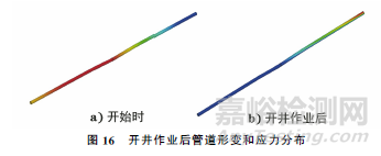 用有限元分析軟件對現(xiàn)場實際工況進(jìn)行模擬,有助于直觀地對開裂原因及過程進(jìn)行說明。管內(nèi)介質(zhì)設(shè)置為天然氣和水,與實際情況一致。開井作業(yè)后,管體內(nèi)流體分布及開裂部位附近形變和應(yīng)力分布如圖15~16所示。由圖15~16可知:在管道起伏部位,開井作業(yè)幾分鐘后,管道內(nèi)發(fā)生湍流,造成局部水壓增大??拷h(huán)焊縫兩端管體外弧側(cè),在介質(zhì)流動的作用下,易形成湍流漩渦,所受沖擊載荷較大,會造成管壁減薄,韌性降低;在開井作業(yè)情況下,閥門開啟后,環(huán)焊縫兩側(cè)應(yīng)力分布較大,易產(chǎn)生水擊效應(yīng),造成壁厚不均,嚴(yán)重時會造成管道脹裂。
