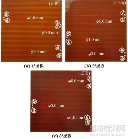 層板試樣的尺寸為長(zhǎng)200 mm,寬200 mm,1,2,3#層板厚度分別為1.21,3.32,4.39 mm。每個(gè)層板均包含直徑分別為1.0,3.0,5.0 mm的圓形人工鋼片,1,2,3#層板缺陷深度分別為0.62,1.60,2.95 mm,層板試樣實(shí)物如圖2所示。