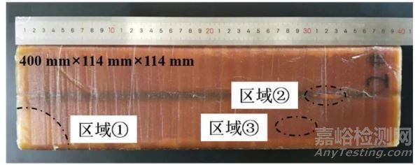 通過(guò)目視檢測(cè)發(fā)現(xiàn)兩個(gè)異常區(qū)域,記作區(qū)域①和②,隨機(jī)選取一處無(wú)異常區(qū)域,記作區(qū)域③,絕緣層試塊實(shí)物如圖4所示。