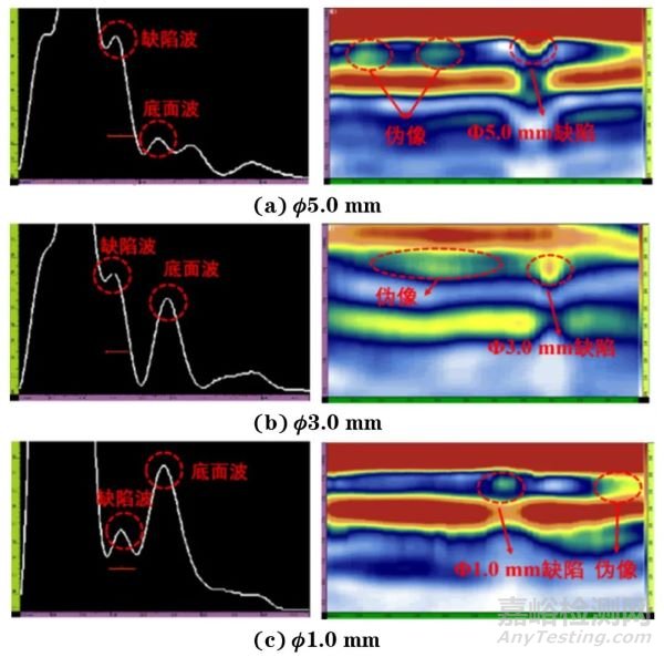 1#層板不同尺寸缺陷的A,B掃描結(jié)果如圖6所示,在A掃描和B掃描中均可以觀察到直徑為5.0,3.0,1.0 mm的缺陷。由于缺陷距離上表面較近(0.62 mm),A掃描中缺陷回波與表面回波略有混疊,但仍能區(qū)分。隨著缺陷直徑尺寸由5.0 mm減小到1.0 mm,缺陷回波幅值逐漸降低。B掃描結(jié)果中缺陷清晰可見,無(wú)缺陷處層間反射回波形成偽像,偽像幅值較缺陷幅值低。