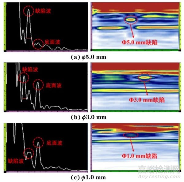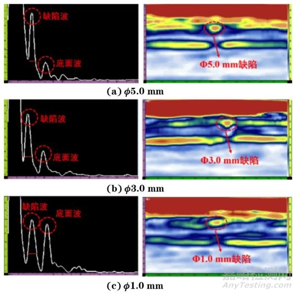 圖7 2#層板不同尺寸缺陷的A,B掃描結(jié)果(左:A掃,右:B掃)