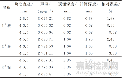 材料本身的非均質(zhì)性會(huì)導(dǎo)致層板聲速存在明顯波動(dòng),故此處采用每個(gè)缺陷附近區(qū)域的聲速對(duì)缺陷深度進(jìn)行計(jì)算,3種厚度層板不同缺陷的定位結(jié)果如表3所示,可見3種不同厚度層板9個(gè)人工鋼片計(jì)算深度與預(yù)埋深度的相對(duì)誤差最大值為3.88%。