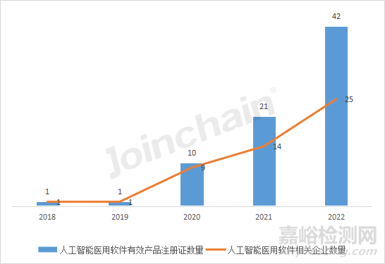 隨著人工智能在醫(yī)學(xué)領(lǐng)域的應(yīng)用不斷發(fā)展和市場(chǎng)對(duì)相關(guān)產(chǎn)品的熱情日趨膨脹,2019年7月國(guó)家藥監(jiān)局發(fā)布了《深度學(xué)習(xí)輔助決策醫(yī)療器械軟件審評(píng)要點(diǎn)》。同年,全國(guó)人工智能醫(yī)療器械標(biāo)準(zhǔn)化技術(shù)歸口單位完成,2020年已立項(xiàng)《人工智能醫(yī)療器械質(zhì)量要求和評(píng)價(jià) 第1部分:術(shù)語(yǔ)》《人工智能醫(yī)療器械質(zhì)量要求和評(píng)價(jià) 第2部分:數(shù)據(jù)集通用要求》兩項(xiàng)基礎(chǔ)通用行業(yè)標(biāo)準(zhǔn),為標(biāo)準(zhǔn)化工作打下良好的開(kāi)端。2022年人工智能醫(yī)用軟件的注冊(cè)數(shù)和相關(guān)企業(yè)在快速增加,有效產(chǎn)品注冊(cè)證數(shù)量共計(jì)42件,同比增長(zhǎng)近一倍;相關(guān)企業(yè)共計(jì)25家,同比增長(zhǎng)78.5%。