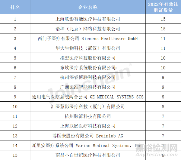 從2022年注冊(cè)情況來(lái)看,上海聯(lián)影智能醫(yī)療科技有限公司(15件)和語(yǔ)坤(北京)網(wǎng)絡(luò)科技有限公司(15件)有效產(chǎn)品注冊(cè)證數(shù)量排名第一,西門(mén)子醫(yī)療有限公司 Siemens Healthcare GmbH(11件)和華大生物科技(武漢)有限公司(11件)緊隨其后。