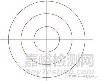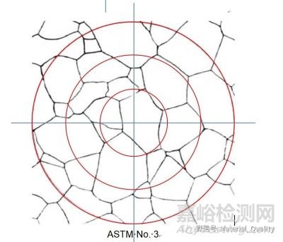 2、測(cè)量網(wǎng)格由三個(gè)同心等距,總周長(zhǎng)為500mm的圓組成,見上圖。將此網(wǎng)格用于測(cè)量任意選擇的五個(gè)不同視場(chǎng)上,分別記錄每次的截點(diǎn)數(shù)。然后計(jì)算出平均晶粒度和置信區(qū)間,如置信區(qū)間不合適,需增加視場(chǎng)數(shù),直至置信區(qū)間滿足要求為止。