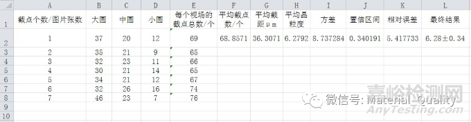 利用Excel編輯晶粒度測(cè)定結(jié)果的置信區(qū)間及相對(duì)誤差的計(jì)算: