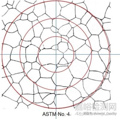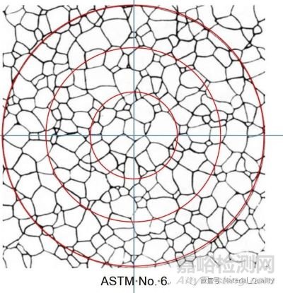 截點(diǎn)法有直線截點(diǎn)法和圓截點(diǎn)法。圓截點(diǎn)法可不必過多的附加視場(chǎng)數(shù),便能自動(dòng)補(bǔ)償偏離等軸晶而引起的誤差,克服了試驗(yàn)線段端部截點(diǎn)法不明顯的毛病。圓截點(diǎn)法作為質(zhì)量檢測(cè)評(píng)估晶粒度的方法是比較合適的。