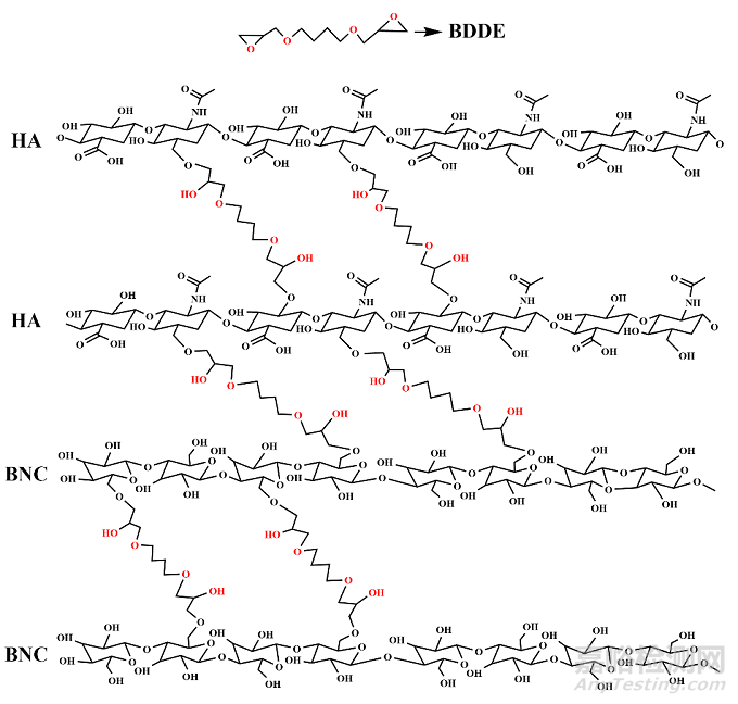 HA具有優(yōu)異的透明度、潤滑性和保濕性,但其力學(xué)性能較差,體內(nèi)易降解。為了解決HA存在的問題,一般使用化學(xué)交聯(lián)延長HA在體內(nèi)的壽命。BDDE具有優(yōu)良的穩(wěn)定性和在醫(yī)療器械中長達15年的安全使用記錄,其交聯(lián)原理是在弱堿性條件下,分子兩端的環(huán)氧基優(yōu)先與HA主鏈中最容易接近的伯醇反應(yīng),從而將HA分子鏈以醚鍵相連(交聯(lián)反應(yīng)示意見圖2)。最近的研究表明將BNC和HA以BDDE交聯(lián)后的復(fù)合膜在傷口護理方面具有巨大潛力。然而,經(jīng)BDDE交聯(lián)的BNC/HA復(fù)合膜尚未研究透明性和角膜細胞的相容性,也尚未開發(fā)作為人工角膜,其在眼部應(yīng)用的可行性未知。