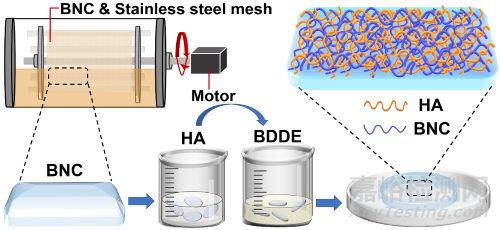 針對上述問題,東華大學(xué)洪楓教授課題組利用水平轉(zhuǎn)鼓生物反應(yīng)器獲得各向異性力學(xué)性能的BNC后,嘗試不同濃度的HA,通過BDDE將BNC與HA進行化學(xué)交聯(lián),從而獲得了BNC/HA復(fù)合膜(制備流程見圖3)。