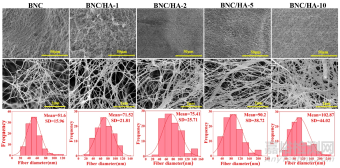 圖 4 不同濃度HA制備的BNC/HA復(fù)合膜的微觀形態(tài)和纖維直徑分布統(tǒng)計