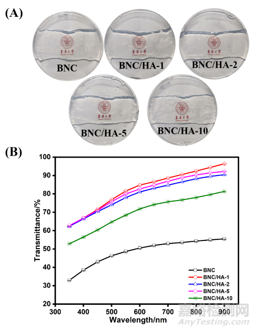 (A)BNC/HA復(fù)合膜的透明度差異;(B)BNC/HA復(fù)合膜透光率。