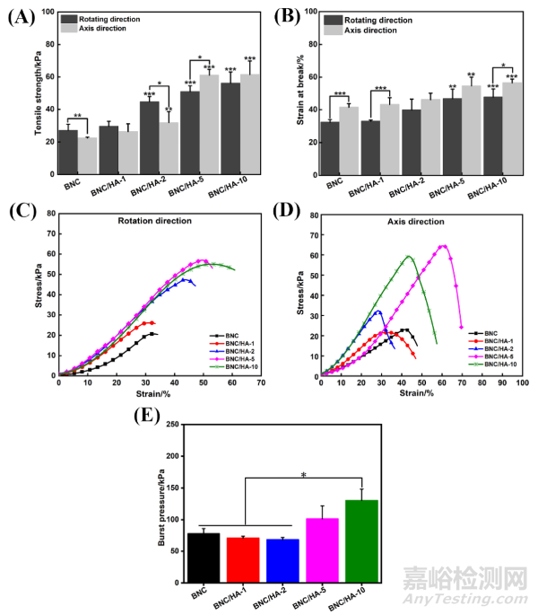 (A)拉伸強度;(B)斷裂伸長率;(C)旋轉(zhuǎn)方向的應(yīng)力−應(yīng)變曲線;(D)軸向的應(yīng)力−應(yīng)變曲線;(E)爆破壓
