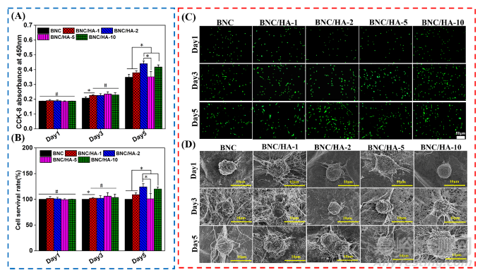 (A)CCK-8;(B)細胞存活率;(C)生長在BNC和BNC/HA復(fù)合膜表面的RCSCs在培養(yǎng)1、3和5天后的熒光顯微形態(tài);(D)RCSCs在BNC和BNC/HA復(fù)合膜上培養(yǎng)1、3和5天后的FE-SEM圖像 (*:0.01<P<0.05,**:0.001<P<0.01,***:P<0.001,#:P>0.05)