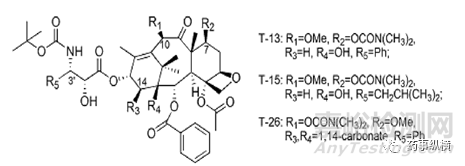 紫杉烷類藥物結(jié)構(gòu)上的優(yōu)化是從以下三個方面進行的:a)克服一代紫杉烷藥物耐藥,b)增加水溶性,c)增加生物利用度。