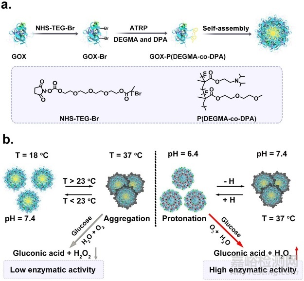 該研究采用葡萄糖氧化酶(GOX)作為原型藥物,它可以消耗腫瘤內(nèi)的葡萄糖,并產(chǎn)生過氧化氫,通過饑餓及氧化作用協(xié)同殺死癌細胞。修飾后的藥物(GOX-P(DEGMA-co-DPA)),包含具有溫敏性的聚(二(乙二醇)甲醚甲基丙烯酸酯)(PDEGMA),及具有酸敏性的聚(2-(二異丙基氨基)乙基甲基丙烯酸酯)(PDPA),因而同時具有溫敏及酸敏特性。溫敏特性便于藥物的純化。酸敏性對于改善藥物的性能有重要的意義:在偏酸性的腫瘤微環(huán)境內(nèi),酸敏性的PDPA被質(zhì)子化從而帶正電荷,更易被癌細胞吸收從而殺死腫瘤細胞;同時促進轉(zhuǎn)吞作用,實現(xiàn)在腫瘤組織內(nèi)部的深入。另外,在腫瘤內(nèi)部,帶正電荷的PDPA與帶負電的GOX能夠形成納米顆粒,阻止了大的聚集物的形成;相反,在腫瘤周邊正常組織的中性環(huán)境下,GOX-P(DEGMA-co-DPA)會形成大的聚集物,從而阻止藥物在正常組織內(nèi)的滲透,降低副作用。