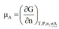 熱力學(xué)第一、第二定律是針對于均相封閉熱力學(xué)系統(tǒng)(單一物質(zhì)或組成不變)進(jìn)行討論的,均相體系吉布斯自由能(G)為壓力和溫度的函數(shù),即G=G(P,T)。然而,對于有相變的系統(tǒng),除壓力和溫度外還需要考慮各組分物質(zhì)的量的變化對體系吉布斯自由能的影響,即G=G(P,T,n1,n2,n3...)。在等溫等壓的熱力學(xué)條件下,在一定濃度的有限量溶液中,加入dnA的A物質(zhì)所引起的吉布斯自由能隨該組分的量的變化率,稱為化學(xué)勢或偏吉布斯自由能,可用公式(1)表示: