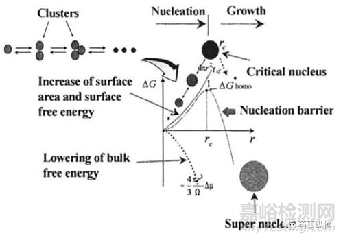 成核(Nucleation),也被稱形核,即生成晶核的過程,是結(jié)晶初始時的“孕育階段”。 在藥物溶液中,分子首先在溶劑(母相)中形成與擬生長晶體具有相同結(jié)構(gòu),并且在給定的晶體生長條件下熱力學(xué)穩(wěn)定的晶胚(團(tuán)簇,Cluster),隨后,當(dāng)團(tuán)簇尺寸大于臨界成核半徑時,形成晶核,尺寸小于臨界晶核的團(tuán)簇稱為亞晶核。在晶核形成前需要經(jīng)過一段時間的誘導(dǎo)期,成核誘導(dǎo)時間是指從成核開始到出現(xiàn)可觀測到晶核所需要的時間,與成核速率成反比。