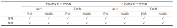 本次試驗(yàn)對象為16臺(tái)空調(diào)樣機(jī),其中8臺(tái)為大匹數(shù)家用中央空調(diào),另外8臺(tái)為小匹數(shù)家用中央空調(diào)。海南省瓊海市濕熱大氣試驗(yàn)站與海南省椰林海洋大氣試驗(yàn)站,每個(gè)試驗(yàn)場地各安裝4臺(tái)大匹數(shù)和4臺(tái)小匹數(shù)家用中央空調(diào)。每種型號的空調(diào)又分為靜態(tài)與動(dòng)態(tài)運(yùn)行對照組以及清洗與未清洗對照組進(jìn)行試驗(yàn),具體的試驗(yàn)對象安排如表1所示。