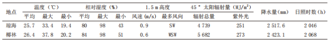 海南瓊海大氣暴露試驗(yàn)場的地理位置為北緯19°14′35〞,東經(jīng)110°28′41〞,海拔高度10.0m;另外一個(gè)椰林試驗(yàn)站的地理位置為北緯19°22′,東經(jīng)110°40′,海拔高度0.44m。兩個(gè)試驗(yàn)場地都設(shè)置了氣象因素監(jiān)測設(shè)備對各類氣象數(shù)據(jù)進(jìn)行監(jiān)測,部分氣象數(shù)據(jù)如表2所示,其中溫度、相對濕度、風(fēng)速為平均值;太陽輻射量、降水量、降水時(shí)數(shù)、日照時(shí)數(shù)為累積量。