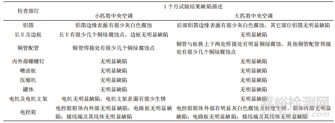 對于試驗(yàn)1個(gè)月的空調(diào)器樣機(jī),無論是安裝在瓊海試驗(yàn)站還是椰林試驗(yàn)站,無論是運(yùn)行還是不運(yùn)行的,無論是清洗還是未清洗,目視所觀測到的缺陷結(jié)果都是一樣,如表4所示為小匹數(shù)中央空調(diào)外機(jī)與大匹數(shù)中央空調(diào)外機(jī)不同部位的試驗(yàn)結(jié)果,表5所示為空調(diào)器主要材料的試驗(yàn)照片分析。