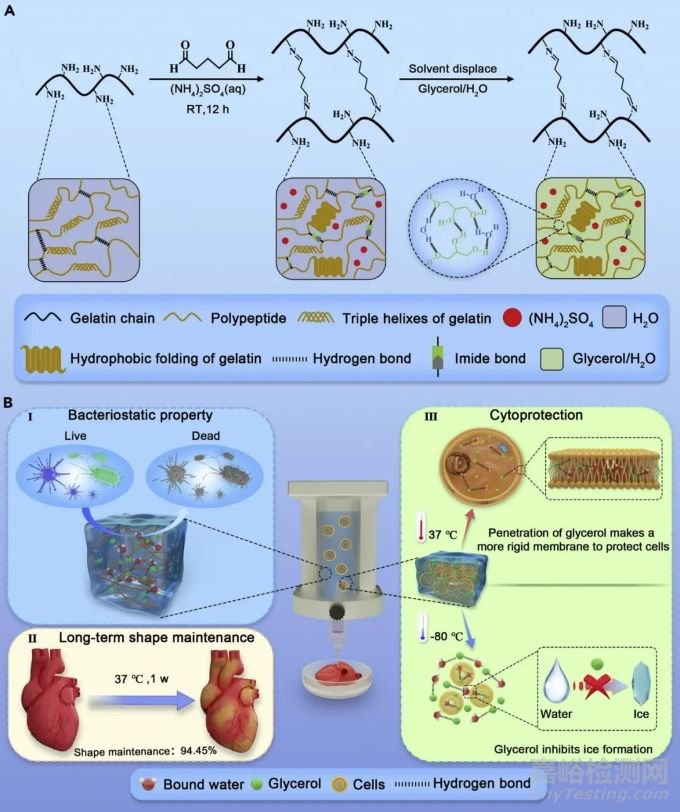 為解決上述問題,來自東華大學游正偉教授團隊通過引入甘油來調(diào)節(jié)水的狀態(tài),開發(fā)設計了一種多功能二元甘油水凝膠生物墨水。該生物墨水以明膠作為基體,以確保生物相容性。明膠通過席夫反應與戊二醛交聯(lián),形成相對穩(wěn)定的聚合物網(wǎng)絡。席夫堿包含動態(tài)亞胺鍵,使交聯(lián)能夠可逆地解離,并在3D打印結束后重新結合。這種動態(tài)結構演變賦予水凝膠剪切稀化和自愈合特性,以確保其在室溫下的可印刷性。同時,甘油、水和聚合物網(wǎng)絡之間形成的大量氫鍵可以減少游離水的含量,從而顯著抑制了細菌的生長、水分的揮發(fā)和生物墨水的結晶。該論文以題為“Intrinsically cryopreservable, bacteriostatic, durable glycerohydrogel inks for 3D bioprinting”發(fā)表在Matter上。