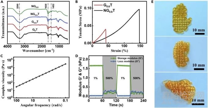圖2. 甘油水凝膠生物墨水的機械性能、剪切稀化和自愈合特性