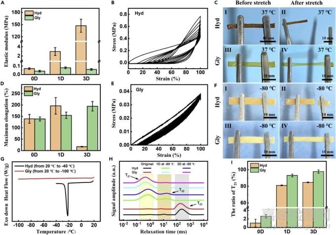 圖3. 甘油水凝膠生物墨水的抗干燥和抗凍性能