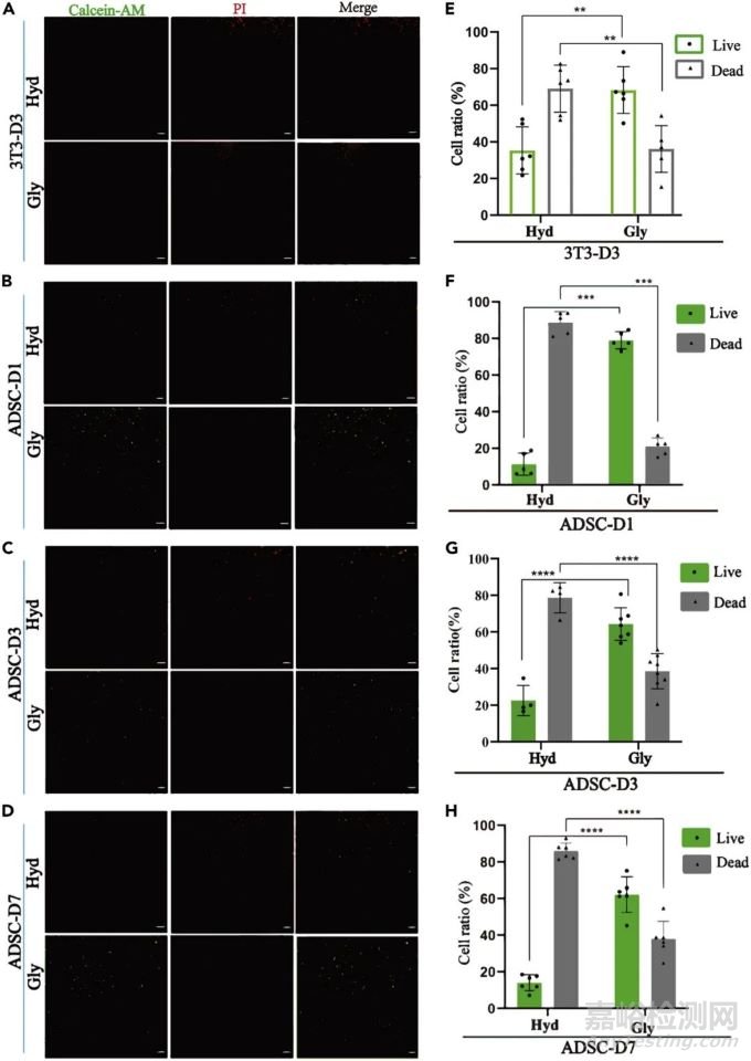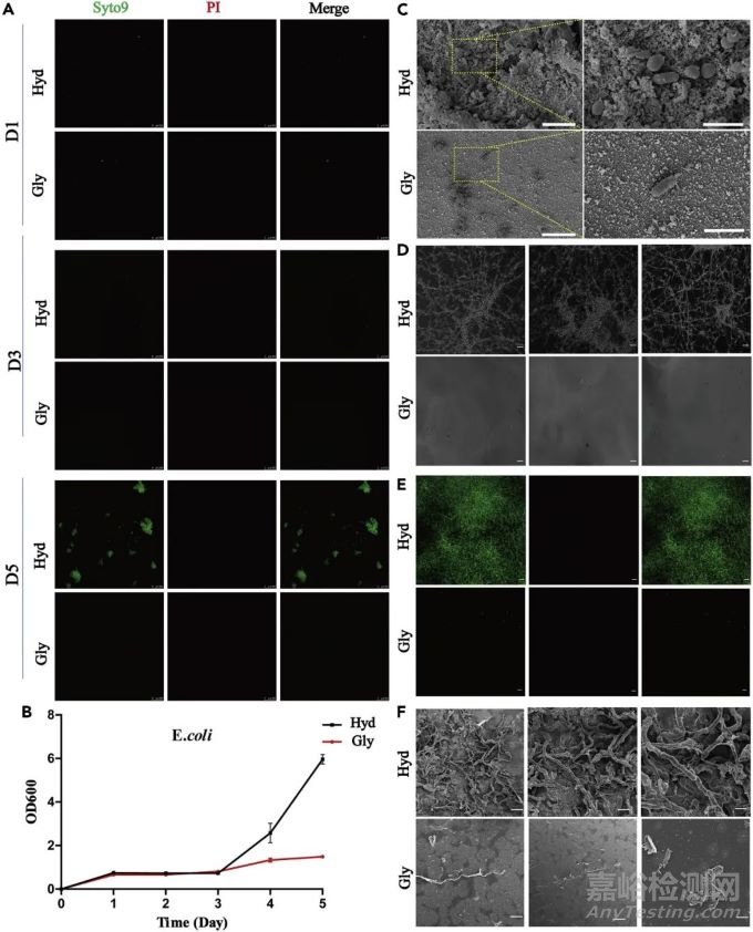 進一步,作者利用大腸桿菌(革蘭氏陰性)在甘油水凝膠貼片上培養(yǎng)5天后活/死細菌的染色情況和細菌生長曲線評估了甘油水凝膠生物墨水的抑菌性能。結果表明,甘油水凝膠生物墨水顯示出明顯的抑制細菌生長的作用。這主要是由于甘油的存在降低了細菌內(nèi)游離水的含量,從而導致滲透壓降低,細菌細胞裂解。