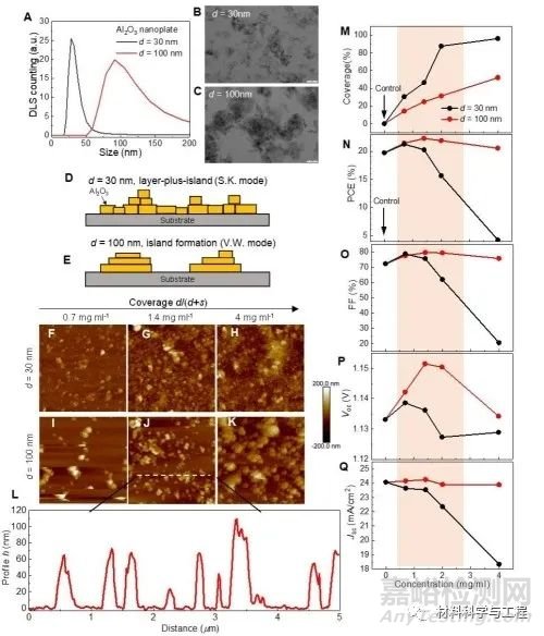 科研團(tuán)隊經(jīng)過長期思考和大量實驗探索,提煉出這種PIC接觸結(jié)構(gòu)方案(圖1)。該研究的主要思想是不依賴傳統(tǒng)納米級鈍化層和遂穿傳輸,而直接使用百納米級厚度的多孔絕緣層,迫使載流子通過局部開孔區(qū)域進(jìn)行傳輸,同時降低接觸面積。研究團(tuán)隊的半導(dǎo)體器件建模計算揭示了這種PIC結(jié)構(gòu)周期應(yīng)與鈣鈦礦載流子傳輸長度匹配的關(guān)鍵設(shè)計原理。PIC方案與晶硅太陽能電池領(lǐng)域的局部接觸技術(shù)有異曲同工之妙,然而,不同的是,鈣鈦礦中的載流子擴(kuò)散長度較單晶硅要短很多,從毫米級別大幅減小到微米甚至更短,這要求PIC的尺寸和結(jié)構(gòu)周期要在百納米級別。傳統(tǒng)的晶硅局部接觸工藝不能直接滿足這種精度要求,而使用高精度微納加工技術(shù)在制備面積和成本方面存在不足。面對這一挑戰(zhàn),科研人員巧妙地利用納米片的尺寸效應(yīng),通過PIC生長方式從常規(guī)“層+島”(Stranski-Krastanov)模式向“島狀”(Volmer-Weber)模式的轉(zhuǎn)變,采用低溫低成本的溶液法實現(xiàn)了這種納米結(jié)構(gòu)的制備(圖2)。