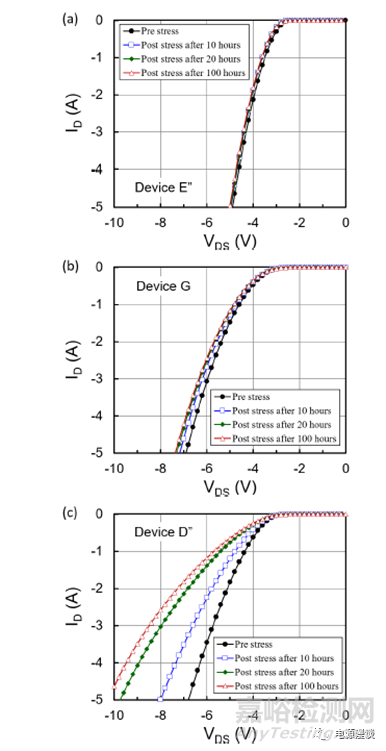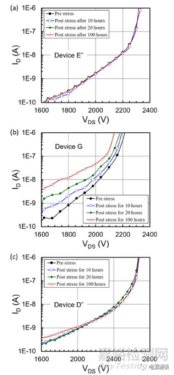 這里展示出門限電壓在體二極管應力測試后沒有改變。再一次的,drain電流在那些具有體二極管降級的器件中降級了,由于SF僅影響漂移層的主要載流子導通。此外,非常清楚的是器件D中,幾乎所有SF被激活了,在20小時后,由于快速的drain電流下降。超過20小時后,僅僅由少量的drain電流改變(體現(xiàn)在斜率上)。