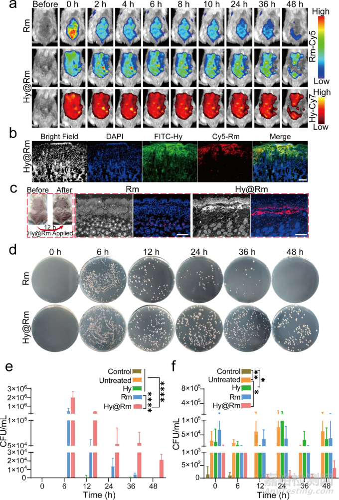 圖4:Hy@Rm的皮表降解、皮膚分布以及體內(nèi)抗菌效果研究