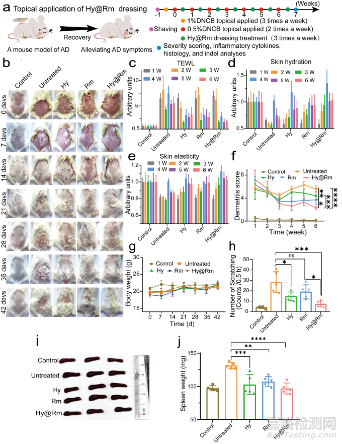 體內(nèi)實(shí)驗(yàn)表明,敷用Hy@Rm治療6周,AD皮膚病變程度得到有效抑制,AD小鼠的皮炎分?jǐn)?shù)顯著降低,皮膚屏障破壞指標(biāo)-經(jīng)皮水分流失(TEWL)下降,皮膚水合作用增加,皮膚彈性增強(qiáng)。此外,Hy@Rm對(duì)AD小鼠的瘙癢行為有明顯的緩解。在治療過程中,沒有觀察到體重有顯著性的波動(dòng),表明Hy、Rm或Hy@Rm 不會(huì)對(duì)AD小鼠產(chǎn)生系統(tǒng)性影響,體現(xiàn)出Hy@Rm的生物安全性(圖5)。