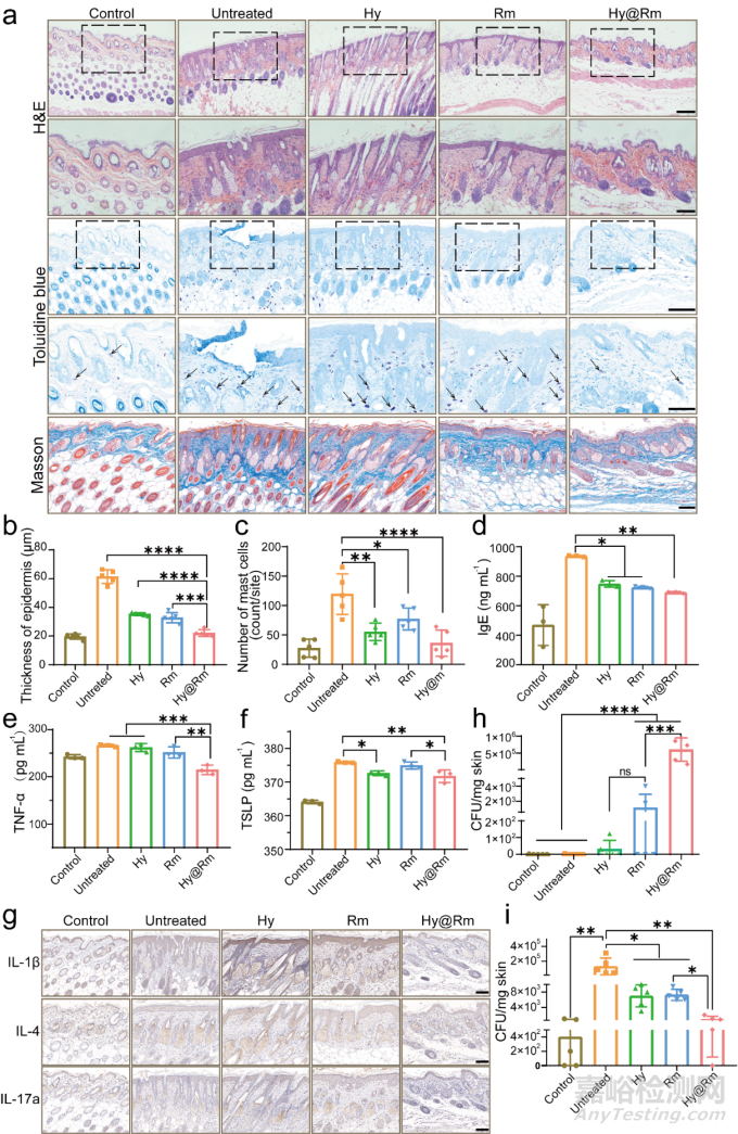 圖5:體內(nèi)應(yīng)用Hy@Rm治療特異性皮炎的效果評(píng)估