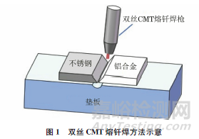 焊接用母材為5083-H111鋁合金板和固溶態(tài)304不銹鋼板,尺寸均為3.00mm×100mm×60mm。在母材單面開“V”形坡口,坡面角度為45°,根部間隙為1mm。焊前用鋼絲刷和砂紙去除表面氧化膜,然后用丙酮擦拭。將粒徑小于75μm、純度為99.99%的鋁粉與Nocolok釬劑按質(zhì)量比4∶6混合,然后加入少量丙酮調(diào)成糊狀,再加入顆粒直徑為1mm左右的分析純酒石酸鉀鈉,最后將混合釬劑刷在待焊不銹鋼板坡口面,厚度為0.2~0.5mm,置于無風(fēng)室內(nèi)晾干。焊接時(shí)所用的焊絲為直徑1.2mm的ER4043(AlSi5)鋁硅焊絲。