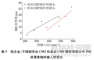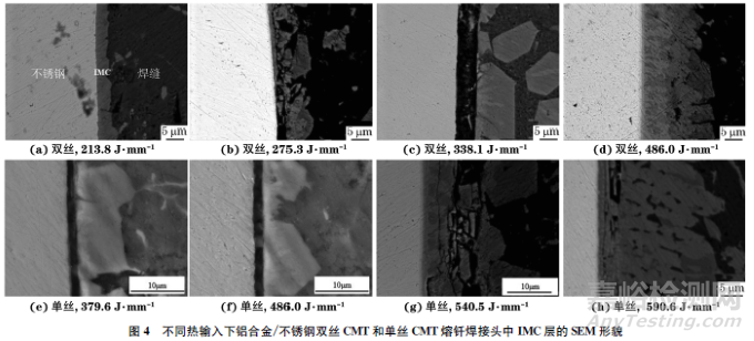 由圖5可見:隨著焊接熱輸入從213.8J·mm-1增加到486.0J·mm-1,鋁合金/不銹鋼雙絲CMT熔釬焊接頭中IMC層厚度從3.36μm增加到18.12μm;隨著焊接熱輸入從379.6J·mm-1增加到590.6J·mm-1,鋁合金/不銹鋼單絲CMT熔釬焊接頭中IMC層厚度從9.59μm增加到26.55μm。隨著熱輸入的增加,接頭中IMC層厚度均呈線性增加趨勢(shì)。在鋁合金/不銹鋼雙絲CMT熔釬焊過程中,鋁熔化,鋼保持固態(tài),形成了鋁/鋼固液界面反應(yīng)體系。隨著熱輸入的增加,鐵和鋁原子的擴(kuò)散速率顯著增加,反應(yīng)時(shí)間延長(zhǎng),從而有利于IMC的生長(zhǎng),因此IMC層的厚度增加。