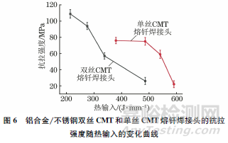 由圖6可以看出,隨著熱輸入的增加,鋁合金/不銹鋼雙絲CMT和單絲CMT熔釬焊接頭的抗拉強(qiáng)度均降低。結(jié)合圖5可知:當(dāng)雙絲CMT熔釬焊接頭中IMC層厚度從3.36μm增加到18.12μm時(shí),其抗拉強(qiáng)度從109MPa降低到26MPa;當(dāng)單絲CMT熔釬焊接頭中IMC層厚度從9.59μm增加到26.55μm時(shí),其抗拉強(qiáng)度從76MPa降低到22MPa。雙絲CMT熔釬焊接頭的最大抗拉強(qiáng)度比單絲CMT熔釬焊接頭高約30%。