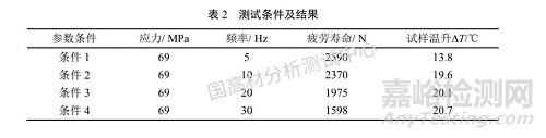 1)試樣溫升隨頻率的增加而增加,而材料循環(huán)次數(shù)隨試樣溫升的增加而降低, 循環(huán)次數(shù)隨頻率的增 加而降低;