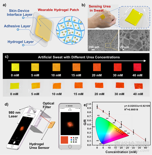 圖(a)設(shè)計(jì)可穿戴水凝膠傳感貼片;(b)汗液中尿素的傳感和水凝膠的SEM圖像;(c)水凝膠傳感貼片在980 nm激發(fā)光和日光下對(duì)尿素的響應(yīng);(d)便攜式尿素檢測(cè)傳感平臺(tái);(e) G/R比值與尿素濃度在0-40 mM范圍內(nèi)的線性關(guān)系。