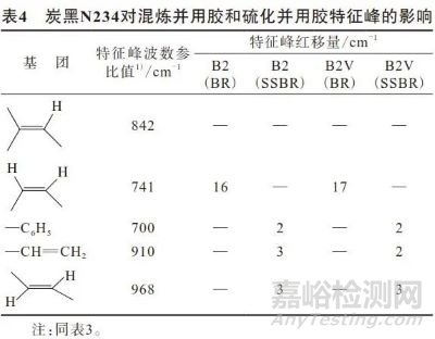 從表4可以看出,與未添加炭黑N234的并用膠相比,添加60份炭黑N234的硫化并用膠的基團(tuán)特征峰紅移規(guī)律與混煉并用膠相同。