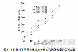 將3種材料在不同溫度下進行預(yù)拉伸,應(yīng)變速率為0.00025s-1,變形量為10%。預(yù)制出形變馬氏體后,測量試樣的形變馬氏體含量,結(jié)果如表2和圖1所示,可知低溫環(huán)境下奧氏體不銹鋼發(fā)生變形時,預(yù)拉伸溫度對形變馬氏體含量的影響較為明顯,3種材料的形變馬氏體含量均隨溫度的降低而增加。