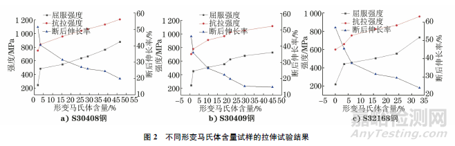 按照GB/T 228.1—2021,對不同形變馬氏體含量的試樣進行拉伸試驗,結(jié)果如圖2所示。從圖2可以看出:3種材料隨著形變馬氏體含量的增加,材料的屈服強度及抗拉強度均有明顯升高,但斷后伸長率逐漸降低;當(dāng)3種材料的形變馬氏體含量超過5%時,斷后伸長率均低于標(biāo)準(zhǔn)要求的下限,隨著形變馬氏體含量的增多,材料的斷后伸長率降低更為明顯;當(dāng)3種材料的形變馬氏體含量超過30%時,材料的斷后伸長率約為25%。由此可見,較高的形變馬氏體含量雖提升了材料的強度,但降低了材料的應(yīng)變?nèi)菹?,顯現(xiàn)出不銹鋼材料典型的應(yīng)變強化特征。