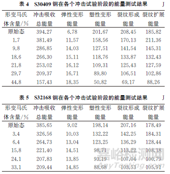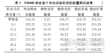 3種材料在各個沖擊試驗階段的能量測試結(jié)果如表3~5所示,可以看出彈性變形能量隨形變馬氏體含量的增加逐漸增加,說明材料發(fā)生彈性形變所需要的能量逐漸增加,形變馬氏體含量的增加使材料更難發(fā)生彈性變形,材料韌性逐漸降低;裂紋形成能量隨形變馬氏體含量的增加逐漸降低,說明隨著形變馬氏體含量的增加,沖擊試樣缺口處更容易產(chǎn)生裂紋,材料韌性逐漸降低;裂紋擴展能量隨著形變馬氏體含量的增加逐漸降低,說明形變馬氏體含量的增加使沖擊試樣缺口處裂紋的擴展速率變大,材料更容易斷裂。