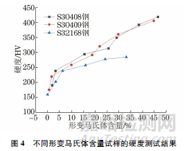 按照GB/T 4340.1—2009 《金屬材料 維氏硬度試驗 第1部分:試驗方法》對不同形變馬氏體含量的試樣進行硬度測試,測試點位于試樣的1/2厚度位置,3種材料的硬度測試結(jié)果如圖4所示。由圖4可以看出:隨著形變馬氏體含量的增加,材料的硬度也隨之增加;S30408鋼和S30409鋼的硬度增加較為明顯,形變馬氏體含量超過40%時,材料的表面硬度均達到了400HV以上;S32168鋼中的形變馬氏體含量超過15%時,材料的硬度增長趨于平緩,形變馬氏體含量為33.1%時,硬度達到了280HV以上。由此可見,形變馬氏體會使材料發(fā)生硬化。