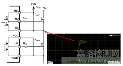 圖1顯示了同步降壓轉(zhuǎn)換器的原理圖以及其開(kāi)關(guān)節(jié)點(diǎn)波形。高側(cè)MOSFET的開(kāi)關(guān)速度和高側(cè)/低側(cè)MOSFET與印刷電路板(PCB)雜散電感和電容都具有在開(kāi)關(guān)節(jié)點(diǎn)波形達(dá)到峰值時(shí)振鈴的功能。而我們不需要開(kāi)關(guān)節(jié)點(diǎn)波形振鈴,因?yàn)樗鼤?huì)增大低側(cè)MOSFET的電壓應(yīng)力,并產(chǎn)生電磁干擾。