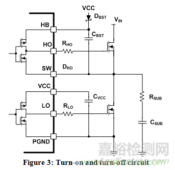 要降低電磁輻射,首先要降低開(kāi)關(guān)節(jié)點(diǎn)的振鈴噪聲。有以下幾種方法:首先減緩MOSFET的接通和關(guān)閉時(shí)間,從而控制開(kāi)關(guān)節(jié)點(diǎn)的上升和下降時(shí)間。在串聯(lián)電阻器(RHO與RLO)上加裝MOSFET的柵極引線即可實(shí)現(xiàn)該功能;參見(jiàn)圖3。第二步是在開(kāi)關(guān)節(jié)點(diǎn)與接地之間加裝一個(gè)緩沖器(RSUB與CSUB)。緩沖器電路可以在轉(zhuǎn)換過(guò)渡期間抑制寄生電感和電容。