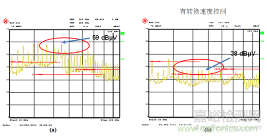 圖5:轉(zhuǎn)換速率控制比較:CISPR 25 Class 5, VIN = 12V, VOUT = 3.3V, IOUT = 5A,無(wú)轉(zhuǎn)換速率控制(a)和有轉(zhuǎn)換速率控制(b)