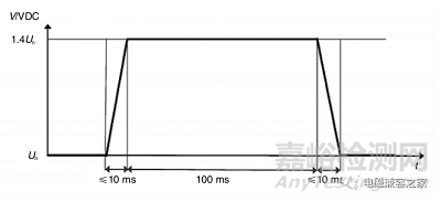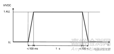 當值為1.4U n 的電壓的持續(xù)時間不超過0.1 s時, 不應導致功能偏差, 設備應滿足性能判據(jù)A。當電壓值為1.4U n 的電值的持續(xù)時間不超過1 s 時,設備應滿足性能判據(jù)B。 試驗應重復10 次。 試驗波形如圖1-2 所示。