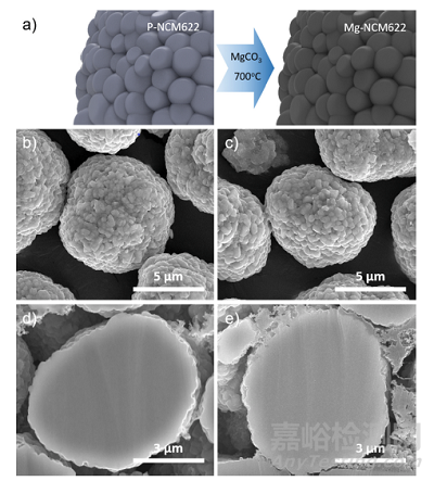 圖1. 原始和摻雜Mg的NCM622顆粒:(a)使用MgCO3前驅(qū)體的Mg摻雜過程示意圖;(b)PNCM622和(c)Mg-NCM622的FESEM圖像;(d)P-NCM622和(e)Mg-NCM622的橫截面FESEM圖像。